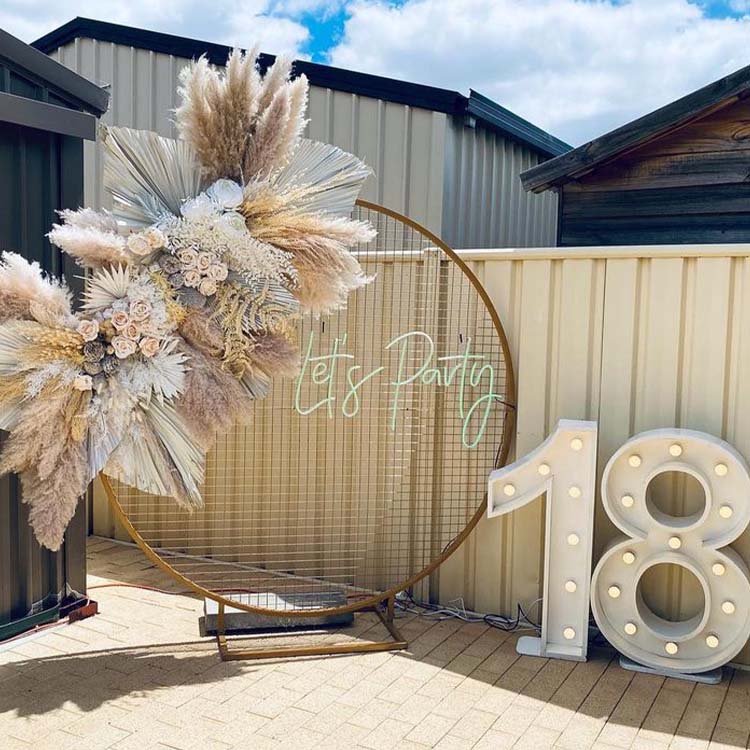 gold metal mesh wrought iron grid round arch circle backdrop stand is a very good background for wedding decoration.Perfect for indoor or outdoor use,It is very easy to assemble and transport, and, because it is made of metal, it is not easily damaged.You can decorate the top with balloons and flowers, or you can hang neon lights in the middle to add atmosphere to your party, and of course, you can hang acrylic panels or other props! this wedding round mesh arch stand is sure to make your big day even more memorable.